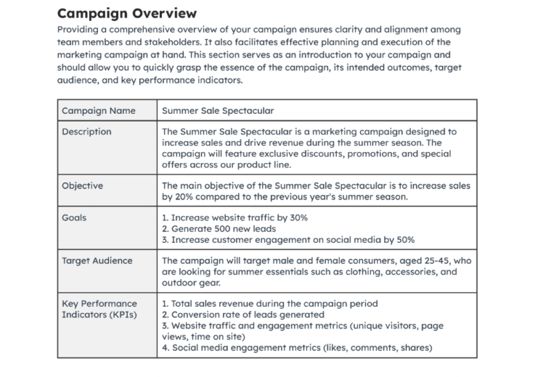 a Table Showing Sample Text of What to Include in a Marketing Campaign, Including the Description, Objectives, Goals, Target Audience, and Kpis.