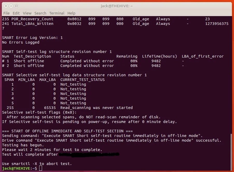 Past the self-test log, there are two values within the output to be examined: